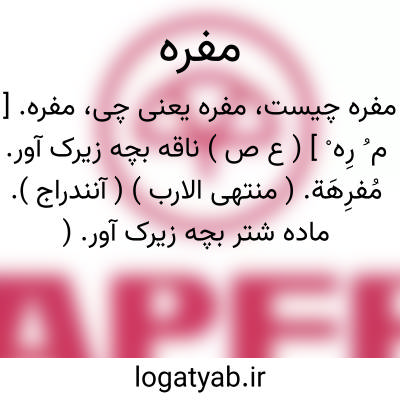 مفره. [ م ُ رِه ْ ] ( ع ص ) ناقه بچه زیرک آور. مُفرِهَة. ( منتهی الارب ) ( آنندراج ). ماده شتر بچه زیرک آور. ( ناظم الاطباء ) ( از اقرب الموارد ). مُفَرّه. مُفَرِّهة. مُفْرِهَة. ( اقرب الموارد ).