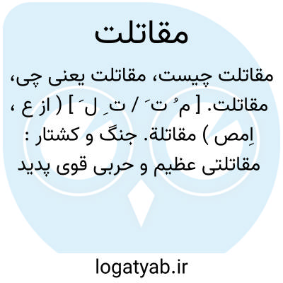 مقاتلت. [ م ُ ت َ / ت ِ ل َ ] ( از ع، اِمص ) مقاتلة. جنگ و کشتار: مقاتلتی عظیم و حربی قوی پدید آمد. ( سندبادنامه ص 202 ). میان فریقین مقاتلتی فاحش رفت و از جانبین قتل بسیار افتاد. ( ترجمه تاریخ یمینی ). بدان صفت هر دو حقیقت شمردند که او [قصاب ] از حال اجتماع ایشان [زن قصاب و باغبان ] خبر داشته است و به مقاتلت آمده. ( مرزبان نامه چ قزوینی ص 134 ). آن کس که به مقابلت و مقاتلت تلقی کرد... به اتباع و اولاد... نیست گردانید. ( جهانگشای جوینی چ قزوینی ج 1 ص 17 ). هنگام مقابلت و مقاتلت صفوف سربه سر حشو باشند و هیچ کدام به میدان مبارزات بارزنشوند. ( جهانگشای جوینی چ قزوینی ج 1 ص 23 ). ایشان درجنگ و مقاتلت مبالغت نمودند. ( جهانگشای جوینی ایضاًص 68 ). امیر خراسان... به پاسخ گفت که کار ایشان زیادت از آن است که با ایشان مقاومت و مقاتلت توانیم کرد. ( سلجوقنامه ظهیری ص 15 ). و رجوع به مقاتلة شود.