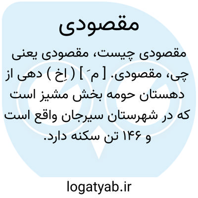 مقصودی. [ م َ ] ( اِخ ) دهی از دهستان حومه بخش مشیز است که در شهرستان سیرجان واقع است و 146 تن سکنه دارد. ( از فرهنگ جغرافیایی ایران، ج 8 ).