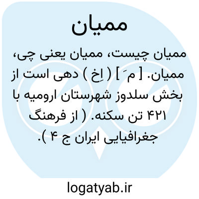 ممیان. [ م َ ] ( اِخ ) دهی است از بخش سلدوز شهرستان ارومیه با 421 تن سکنه. ( از فرهنگ جغرافیایی ایران ج 4 ).