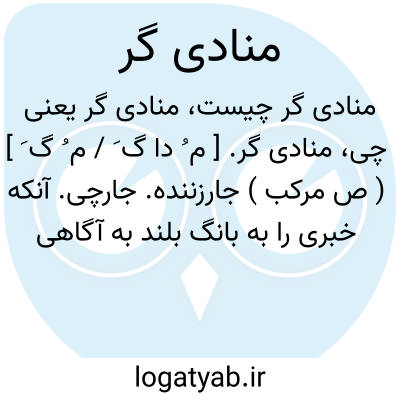 منادی گر. [ م ُ دا گ َ / م ُ گ َ ] ( ص مرکب ) جارزننده. جارچی. آنکه خبری را به بانگ بلند به آگاهی عموم برساند: