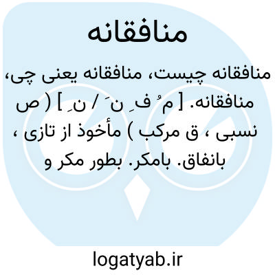 منافقانه. [ م ُ ف ِ ن َ / ن ِ ] ( ص نسبی، ق مرکب ) مأخوذ از تازی، بانفاق. بامکر. بطور مکر و نفاق و دورویی. ( از ناظم الاطباء ). همچون منافقان. || ملحدانه و کافرانه. ( ناظم الاطباء ). رجوع به منافق شود.