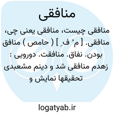 هم بی نمکی منافقی باید.خاقانی ( دیوان چ سجادی ص 592 ).- منافقی کردن؛ دورویی کردن. نفاق ورزیدن: بداند آن کسها که منافقی کردند و گفت ایشان را، بیایید و کارزار کنید اندر راه خدای یا بازدارید. ( ترجمه تفسیری طبری چ حبیب یغمایی ج 1 ص 263 ).