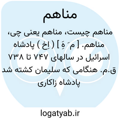 مناهم. [ م َ هَِ ] ( اِخ ) پادشاه اسرائیل در سالهای 747 تا 738 ق.م. هنگامی که سلیمان کشته شد پادشاه زاکاری برای به دست آوردن فرمانروائیش دست به کار شده و مناهم که از وابستگان سلیمان بود علیه زاکاری ( زکریا ) قیام کرد و او را کشت. او در بیرحمی و ستمکاری شهرت داشت. و در سال 738 ق. م. مجبور به پرداخت خراج به «تگلات فالازار» سوم پادشاه آشور گردید که قسمت شمالی سوریه را به تصرف خویش درآورده بود. ( از لاروس بزرگ ).