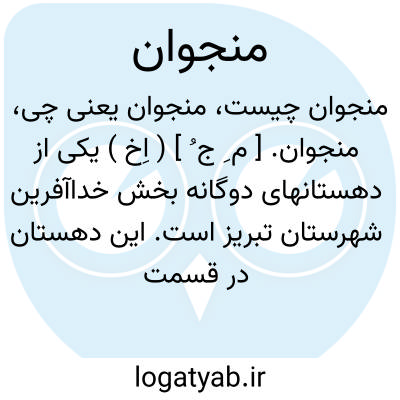 منجوان. [ م ِ ج ُ ] ( اِخ ) یکی از دهستانهای دوگانه بخش خداآفرین شهرستان تبریز است. این دهستان در قسمت شمال باختری اهر واقع و از شمال به رودخانه ارس، از جنوب به دهستان حسن آباد و میشه پاره، از مشرق به دهستان کیوان و از باختر به دهستان دیزمار خاوری و رودخانه ارس محدود می باشد. هوای آن درقسمت شمال گرمسیر و در قسمت جنوب معتدل مایل به گرمی است. اکثر آبادیهای این دهستان از رودخانه های کلیبر، قره سو و ایلفنا استفاده می کنند. این دهستان از 63آبادی کوچک و بزرگ تشکیل شده و جمعیت آن در حدود 8464 تن است. قرای مهم آن عبارتند از: ستن، عاشقلو، داشباشی و جانانلو. ( از فرهنگ جغرافیایی ایران ج 4 ).