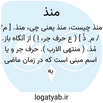 منذ. [ م ُ / م ِ ذُ ] ( ع حرف جر، اِ ) از آنگاه باز. مُذ. ( منتهی الارب ). حرف جر و یا اسم مبنی است که در زمان ماضی به معنی از و در زمان حاضر به معنی در و اگر زمان معدود باشد به معنی از مدت می آید. ( ناظم الاطباء ). رجوع به مذ شود.