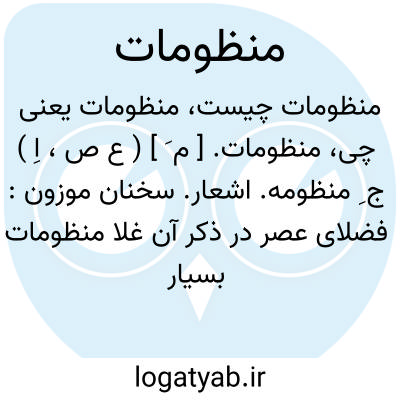 منظومات. [ م َ ] ( ع ص، اِ ) ج ِ منظومه. اشعار. سخنان موزون: فضلای عصر در ذکر آن غلا منظومات بسیار گفتند. ( ترجمه تاریخ یمینی چ 1 تهران ص 330 ). رجوع به منظومه شود.