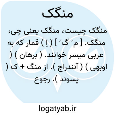 منگک. [ م َ گ َ ] ( اِ ) قمار که به عربی میسر خوانند. ( برهان ) ( اوبهی ) ( آنندراج ). از منگ + ک ( پسوند ). رجوع به منگ شود. ( حاشیه برهان قاطع چ معین ). || لاف وگزاف. ( برهان ). لاف و گزاف و لاف زن. ( ناظم الاطباء ).