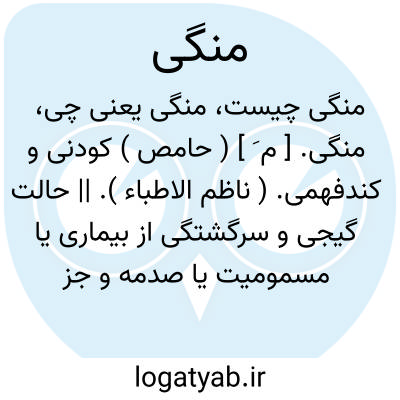 منگی. [ م َ ] ( حامص ) کودنی و کندفهمی. ( ناظم الاطباء ). || حالت گیجی و سرگشتگی از بیماری یا مسمومیت یا صدمه و جز اینها. رجوع به منگ شود.