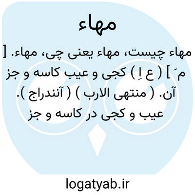 مهاء. [ م َ ] ( ع اِ ) کجی و عیب کاسه و جز آن. ( منتهی الارب ) ( آنندراج ). عیب و کجی در کاسه و جز آن. ( از اقرب الموارد ) ( ناظم الاطباء ).