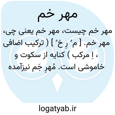 مهر خم. [ م ُ رِ خ ُ ] ( ترکیب اضافی، اِ مرکب ) کنایه از سکوت و خاموشی است. مُهرِ جَم نیزآمده است و مُهرِ فَم هم، و این اخیر صحیح است یعنی مهر دهان. ( از برهان ).
