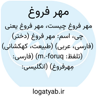 معنی: ترکیب دو اسم مهر و فروغ ( خورشید و روشنی )، با فروغی چون مهر، ( به مجاز ) زیبا و تابناک