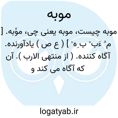 مؤبه. [ م ُ ءَب ْ ب ِه ْ ] ( ع ص ) یادآورنده. آگاه کننده. ( از منتهی الارب ). آن که آگاه می کند و به کسی یاد می هد. ( ناظم الاطباء ). به یاددهنده. ( آنندراج ). || تهمت زننده. تهمت نهنده او را به... ( از منتهی الارب ). || آن که توقیر می کند کسی را و احترام می نماید و ستایش می کند. ( ناظم الاطباء ).