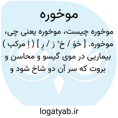 موخوره. [ خوَ / خ ُ رَ / رِ ] ( اِ مرکب ) بیماریی در موی گیسو و محاسن و بروت که سر آن دو شاخ شود و ریختن گیرد. مرضی در موی که سر آن دو شقه کند و بریزاند. بیماریی است در موی که سر آن دو شقه شود و بریزد و دو شاخ شدن موی را عرب تمریط گوید. ( یادداشت مؤلف ). || جرثومه و میکربی که مایه فساد و ریختن موی شود. ( یادداشت مؤلف ). || داءالثعلب. ( یادداشت مؤلف ).