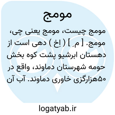 مومج. [ م ِ ] ( اِخ ) دهی است از دهستان ابرشیو پشت کوه بخش حومه شهرستان دماوند، واقع در 50هزارگزی خاوری دماوند. آب آن از رودخانه دلیچای و راه آن مالرو است. ( از فرهنگ جغرافیائی ایران ج 1 ). از محال دماوند است. ( یادداشت مؤلف ). از توابع تهران و دارای معدن زغال سنگ است. ( از جغرافیای سیاسی کیهان ). دریاچه ای هم دارد.