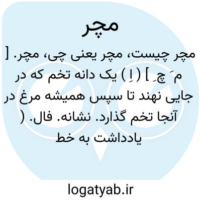 مچر. [ م َ چ ِ ] ( اِ ) یک دانه تخم که در جایی نهند تا سپس همیشه مرغ در آنجا تخم گذارد. نشانه. فال. ( یادداشت به خط مرحوم دهخدا ). و رجوع به مچی و مچیل شود.