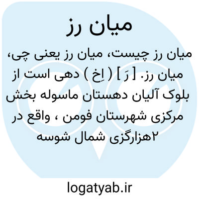 میان رز. [ رَ ] ( اِخ ) دهی است از بلوک آلیان دهستان ماسوله بخش مرکزی شهرستان فومن، واقع در 2هزارگزی شمال شوسه فومن به ماسوله. با 164 تن سکنه. آب آن از رود ماسوله و چشمه و راه آن ماشین رو است. ( از فرهنگ جغرافیائی ایران ج 2 ).