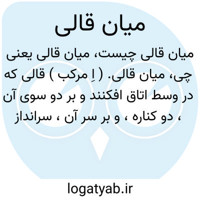 میان قالی. ( اِ مرکب ) قالی که در وسط اتاق افکنند و بر دو سوی آن، دو کناره، و بر سر آن، سرانداز افکنند. قالی عریض که میان دو کناره زیر سرانداز گسترند. ( یادداشت مؤلف ).