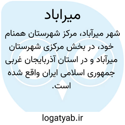 میرآباد. میرآباد، شهری در بخش مرکزی شهرستان میرآباد استان آذربایجان غربی ایران است. این شهر، مرکز شهرستان میرآباد است.
