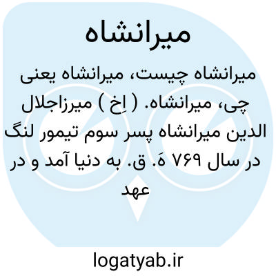 میرانشاه. ( اِخ ) میرزاجلال الدین میرانشاه پسر سوم تیمور لنگ در سال 769 هَ. ق. به دنیا آمد و در عهد پدر به فرمانروائی عراق و آذربایجان و دیاربکر و شام رسید. در اواخر کار تیمور دچار پریشانی مغز شد وبا وجود این حال پس از مرگ پدر سه سال سلطنت کرد تاسرانجام در سال 810 هَ. ق. در جنگ با سپاه قره قویونلو در حدود آذربایجان به دست قرایوسف ترکمان کشته شد. میرانشاه فرزندان بسیاری داشت و شاهان گورکانی هند همگی از نسل وی می باشند. ( از قاموس الاعلام ترکی ).