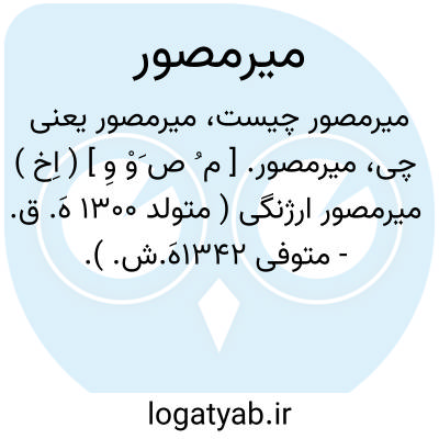 میرمصور. [ م ُ ص َوْ وِ ] ( اِخ ) میرمصور ارژنگی ( متولد 1300 هَ. ق. - متوفی 1342هَ.ش. ). نقاش ایرانی. در تبریز متولد شد. از ده سالگی شروع به نقاشی کرد. در طول عمری متجاوز از 80 سال، تابلوهای متعدد با رنگ و روغن و آبرنگ بوجود آورد.از معروفترین آنهاست: «حمله نادر به هندوستان » و شاپور و اسیری والرین، امیرکبیر و تابلوهای رضاشاه.