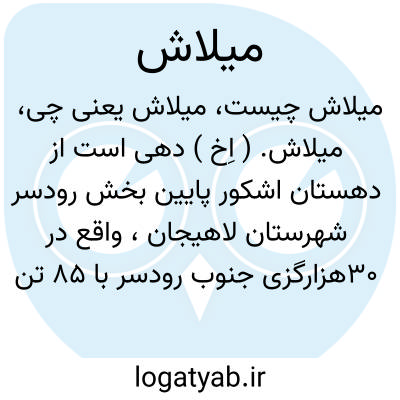میلاش. ( اِخ ) دهی است از دهستان اشکور پایین بخش رودسر شهرستان لاهیجان، واقع در 30هزارگزی جنوب رودسر با 85 تن سکنه. آب آن از چشمه و راه آن مالروو صعب العبور است. ( از فرهنگ جغرافیائی ایران ج 2 ).