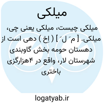 میلکی. [ م َ ل َ ] ( اِخ ) دهی است از دهستان حومه بخش گاوبندی شهرستان لار، واقع در 4هزارگزی باختری گاوبندی با 210 تن سکنه. آب آن از چاه و راه آن ماشین رو است. ( از فرهنگ جغرافیائی ایران ج 7 ).
