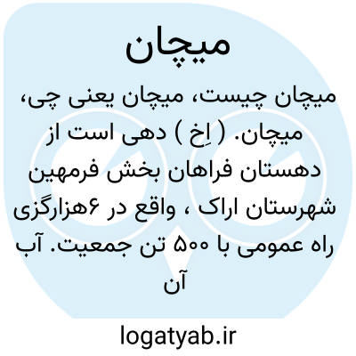 میچان. ( اِخ ) دهی است از دهستان فراهان بخش فرمهین شهرستان اراک، واقع در 6هزارگزی راه عمومی با 500 تن جمعیت. آب آن از قنات و راه آن ماشین رو است. ( از فرهنگ جغرافیائی ایران ج 2 ).