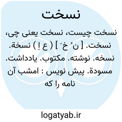 نسخة. [ ن ُ خ َ ] ( ع اِ ) کتابی که از آن نقل کنند. ( منتهی الارب ). کتابی که از وی نقل کنند واز روی آن نویسند. ( ناظم الاطباء ). کتاب منقول. ( معجم متن اللغة ). ج، نُسَخ. رجوع به نسخت و نسخه شود.
