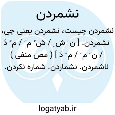 نشمردن. [ ن َ ش ِ / ش ُ م َ / م ُ دَ / ن َ م َ / م ُ دَ ] ( مص منفی ) ناشمردن. نشماردن. شماره نکردن. مقابل شمردن. رجوع به شمردن شود. || به حساب نیاوردن. منظور نداشتن. نپنداشتن: مرد دانا صاحب مروت را حقیر نشمرد. ( کلیله و دمنه ).