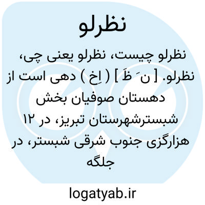 نظرلو. [ ن َ ظَ ] ( اِخ ) دهی است از دهستان صوفیان بخش شبسترشهرستان تبریز، در 12 هزارگزی جنوب شرقی شبستر، در جلگه معتدل هوائی واقع است و 1928 تن سکنه دارد. آبش از چشمه تأمین می شود. محصولش غلات و شغل اهالی زراعت و گله داری است. ( از فرهنگ جغرافیایی ایران ج 4 ).