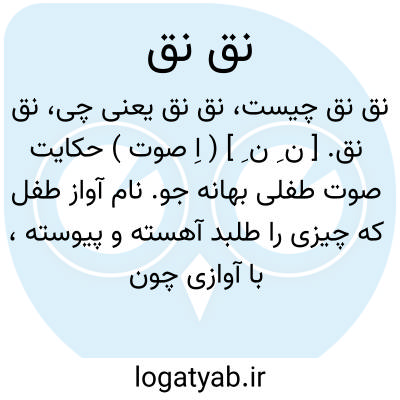 نق نق. [ ن ِ ن ِ ] ( اِ صوت ) حکایت صوت طفلی بهانه جو. نام آواز طفل که چیزی را طلبد آهسته و پیوسته، با آوازی چون گریان. ( یادداشت مؤلف ). نغ نغ.، نقنق. [ ن ِ ن ِ ] ( ع اِ ) شترمرغ گریزان یا سبک. ( منتهی الارب ) ( آنندراج ) ( از ناظم الاطباء ). ظلیم. شترمرغ. ( از اقرب الموارد ). شترمرغ یا شترمرغ نافر و گریزان یا شترمرغ سبک وزن. ( از متن اللغة ). تأنیث آن نقنقة است. ( از منتهی الارب ). ج، نَقانِق.