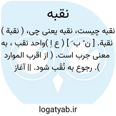 ( نقبة ) نقبة. [ ن ُ ب َ ] ( ع اِ )واحد نقب، به معنی جرب است. ( از اقرب الموارد ). رجوع به نُقَب شود. || آغاز گر. ( منتهی الارب ). آغاز گر و جرب. ( ناظم الاطباء ) ( از اقرب الموارد ) ( از المنجد ). اول گرگنی اشتر. ( مهذب الاسماء ). ج، نُقب و نُقَب. || وجه. ( اقرب الموارد ) ( متن اللغة ) ( المنجد ). روی. ( منتهی الارب ) ( ناظم الاطباء ). || ثقب. ( اقرب الموارد ) ( المنجد ). ثقبه. سوراخ. ( یادداشت مؤلف ). سوراخ. ( مهذب الاسماء ). سوراخ عمیق نافذ. ( ناظم الاطباء ). || رنگ. ( منتهی الارب ) ( آنندراج ). گونه. ( مهذب الاسماء ). لون. ( اقرب الموارد ) ( متن اللغة ). || آواز. ( منتهی الارب ) ( آنندراج ) ( ناظم الاطباء ). رجوع به معنی بعدی شود. || زنگ زدگی. صداء. ( اقرب الموارد ) ( تاج العروس ) ( متن اللغة ) ( المنجد ). || میزرمانندی است بی نیفه که در آن سجاف دوزند یا شلوار بی پای. ( منتهی الارب ) ( آنندراج ). مئزرمانندی بی نیفه که بر آن سجاف دوزند و شلوار بی پاچه. ( ناظم الاطباء ). جامه ای است ازارمانند که سجاف بدون نیفه ای دور آن است و مانند شلوار بسته می شود. ( ازاقرب الموارد ). لباسی است که قسمت بالای آن چون شلوار است و گفته اند شلوار بدون ساقین است. ( از لسان العرب ). گویند: ما علیها الا نقبة. ( اقرب الموارد ). و گویند: نقبت الثوب نقباً؛ جعلته نقبه. ( منتهی الارب ).
