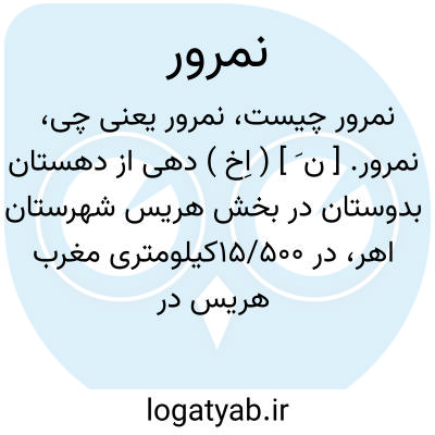 نمرور. [ ن َ ] ( اِخ ) دهی از دهستان بدوستان در بخش هریس شهرستان اهر، در 15/500کیلومتری مغرب هریس در جلگه معتدل هوائی واقع است و 1339 تن سکنه دارد. آبش از دو رشته چشمه، محصولش غلات و میوه های درختی و حبوبات، شغل اهالی زراعت و گله داری و جاجیم بافی و فرش بافی است. ( از فرهنگ جغرافیایی ایران ج 4 ).