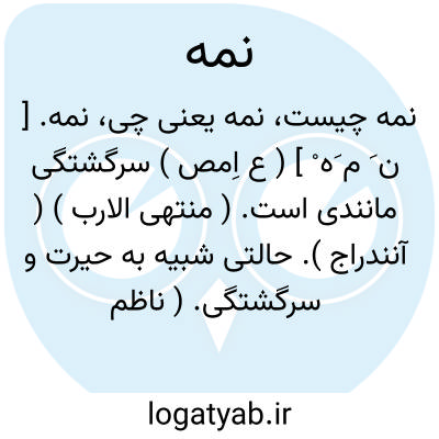 نمه. [ ن َ م ِه ْ ] ( ع ص ) نامه. آنکه به شبه حیرت دچار است. ( اقرب الموارد )( از متن اللغة ) ( از المنجد ). رجوع به نَمَه ْ شود.