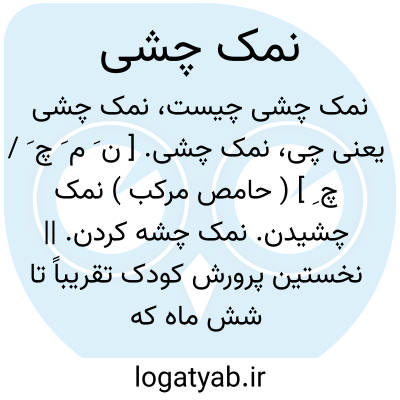 نمک چشی. [ ن َ م َ چ َ / چ ِ ] ( حامص مرکب ) نمک چشیدن. نمک چشه کردن. || نخستین پرورش کودک تقریباً تا شش ماه که در این مدت کمال توجه و نوازش را درباره وی معمول می دارند. ( ناظم الاطباء ).