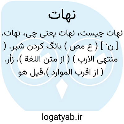 نهات. [ ن َهَْ ها ] ( ع ص ) خر بسیاربانگ. ( منتهی الارب ). حمار نهاق. ( متن اللغة ) ( از اقرب الموارد ). || مرد سخت بانگ. ( منتهی الارب ). مرد زحار. ( از متن اللغة ) ( از اقرب الموارد ). || شیر بیشه سخت آواز. ( منتهی الارب ). اسد. شیر. ( از اقرب الموارد ).