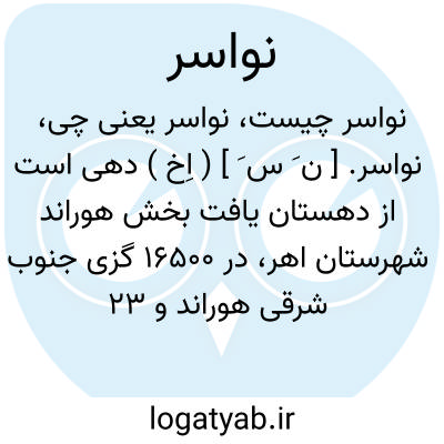نواسر. [ ن َ س َ ] ( اِخ ) دهی است از دهستان یافت بخش هوراند شهرستان اهر، در 16500 گزی جنوب شرقی هوراند و 23 هزارگزی جاده اهر به کلیبر، در منطقه کوهستانی معتدل هوائی واقع است و 298 تن سکنه دارد. آبش از چشمه، محصولش غلات و سردرختی، شغل اهالیش زراعت و گله داری و فرش بافی و گلیم بافی است. ( از فرهنگ جغرافیایی ایران ج 4 ) ( آمار عمومی سال 1335 هَ. ش. ).