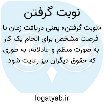 «نوبت گرفتن» یعنی شخص برای انجام یک عمل، جایگاه یا زمان تعیین‌شده‌ای را برای خود دریافت کند. این مفهوم معمولاً در صف‌ها، ملاقات‌ها، خدمات پزشکی، اداری یا آموزشی کاربرد دارد تا هر فرد فرصت عادلانه‌ای برای انجام کار خود داشته باشد. وقتی فرد نوبت می‌گیرد، یعنی به ترتیب و عدالت، زمان یا موقعیتی به او اختصاص داده شده تا بدون تداخل با دیگران عمل کند. نوبت گرفتن موجب کاهش آشفتگی و جلوگیری از برخورد یا نزاع میان افرادی می‌شود که قصد انجام کار مشابهی دارند. روش‌های نوبت گرفتن می‌تواند به صورت حضوری، تلفنی، اینترنتی یا با کارت و سامانه‌های الکترونیکی انجام شود. در معنای اجتماعی و اخلاقی، نوبت گرفتن گاهی به معنای رعایت انصاف و صبر برای رسیدن به فرصت مناسب است. این عمل به افراد کمک می‌کند که برنامه‌ریزی بهتری داشته باشند، زمان خود را مدیریت کنند و از فرصت‌ها به شکل مؤثر بهره‌برداری کنند.
