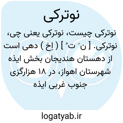 نوترکی. [ ن َ ت ُ ] ( اِخ ) دهی است از دهستان هندیجان بخش ایذه شهرستان اهواز، در 18 هزارگزی جنوب غربی ایذه در منطقه کوهستانی معتدل هوائی واقع است و 119 تن سکنه دارد. آبش از چشمه، محصولش غلات، شغل مردمش زراعت است. ( از فرهنگ جغرافیایی ایران ج 6 ).