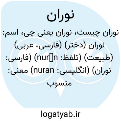 معنی: منسوب به نور، روشن، درخشان، ( به مجاز ) زیباروی، ( نور، ان ( پسوند نسبت ) )، ( عربی ـ فارسی ) ( نور + ان ( پسوند نسبت ) )، نور ( عربی ) + ان ( فارسی ) مرکب از نور ( روشنایی ) + ان ( پسوند اتصاف )، نام روستایی در نزدیکی اردبیل