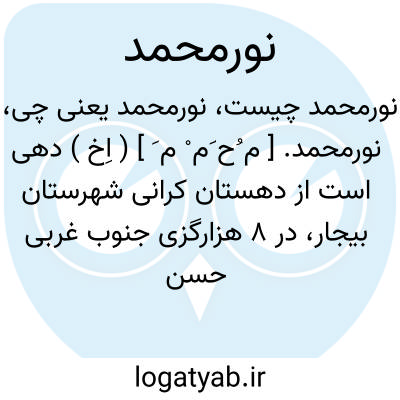 نورمحمد. [ م ُح َم ْ م َ ] ( اِخ ) دهی است از دهستان کرانی شهرستان بیجار، در 8 هزارگزی جنوب غربی حسن آبادسوگند و 4 هزارگزی مغرب نوشاد، در منطقه کوهستانی سردسیری واقع است و 200 تن سکنه دارد. آبش از رودخانه و چشمه، محصولش غلات و لبنیات و انگور، شغل مردمش زراعت و گله داری و جاجیم بافی است. ( از فرهنگ جغرافیایی ایران ج 5 ).