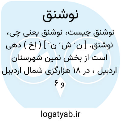 نوشنق. [ ن َ ش َ ن َ ] ( اِخ ) دهی است از بخش نمین شهرستان اردبیل، در 18 هزارگزی شمال اردبیل و 6 هزارگزی جاده اردبیل به آستارا، در جلگه معتدل هوائی واقع است و 479 تن سکنه دارد. آبش از چشمه، محصولش غلات و حبوبات، شغل مردمش زراعت و گله داری است. ( از فرهنگ جغرافیایی ایران ج 4 ).