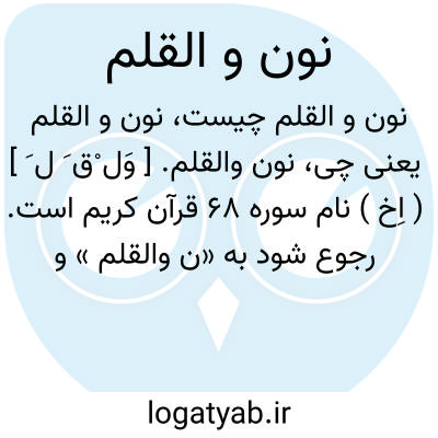 نون والقلم. [ وَل ْق َ ل َ ] ( اِخ ) نام سوره 68 قرآن کریم است. رجوع شود به «ن والقلم » و نون. || ( اِ مرکب ) کنایه از دنیا، زیراکه دوات و قلم و نوشتن و خواندن همه از لوازم دنیاست و نام دنیاست. ( از غیاث اللغات ).
