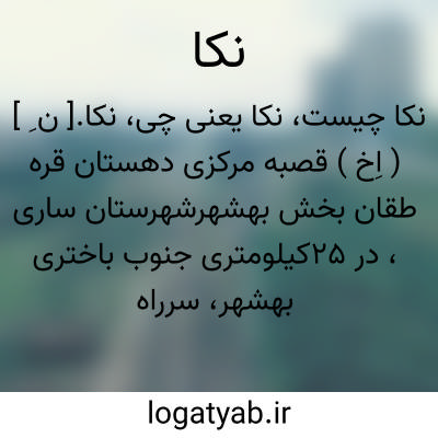نکا.[ ن ِ ] ( اِخ ) قصبه مرکزی دهستان قره طقان بخش بهشهرشهرستان ساری، در 25کیلومتری جنوب باختری بهشهر، سرراه شوسه ساری به بهشهر واقع است و 2000 تن سکنه دارد. رودخانه نکا آن را مشروب می کند. محصولش برنج، غلّه، مرکبات، پنبه، کنف و کنجد است. کارخانه برنج کوبی و کارخانه آردسازی دارد. ( فرهنگ فارسی معین ).
