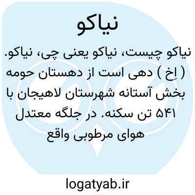 نیاکو. ( اِخ ) دهی است از دهستان حومه بخش آستانه شهرستان لاهیجان با 541 تن سکنه. در جلگه معتدل هوای مرطوبی واقع است و محصولش برنج و ابریشم و کنف است. ( از فرهنگ جغرافیائی ایران ج 2 ).