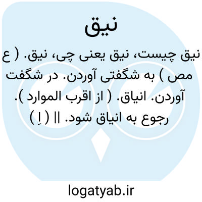 نیق. ( ع مص ) به شگفتی آوردن. در شگفت آوردن. انیاق. ( از اقرب الموارد ). رجوع به انیاق شود. || ( اِ ) بالای کوه. ( مهذب الاسماء ). بلندترین جای از کوه. ( منتهی الارب ) ( از اقرب الموارد ) ( از متن اللغة ). ج، نیاق. انیاق. نیوق.
