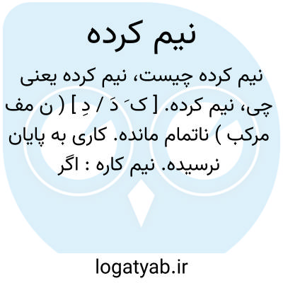 نیم کرده. [ ک َ دَ / دِ ] ( ن مف مرکب ) ناتمام مانده. کاری به پایان نرسیده. نیم کاره: اگر پادشاهی سرائی مرتفع بنا افکندی... و آن بنا در روزگار او تمام نشدی پسر او... بر هیچ چیز چنان جد ننمودی که آن بناء نیم کرده آن پادشاه تمام کردی... گفتی بر پسر فریضه تر که نیم کرده پدر خویش را تمام کند. ( نوروزنامه ).