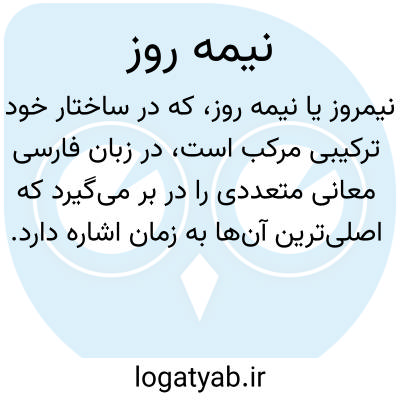 نیمروز یا نیمه روز، که در ساختار خود ترکیبی مرکب است، در زبان فارسی معانی متعددی را در بر می‌گیرد که اصلی‌ترین آن‌ها به زمان اشاره دارد. به طور کلی، این اصطلاح در مفهوم نخست به نقطه‌ی اوج روز، یعنی ظهر، اطلاق می‌شود؛ لحظه‌ای که خورشید در بالاترین ارتفاع خود قرار داشته و سایه‌ها به کوتاه‌ترین حالت ممکن می‌رسند، که این معنا با وسط روز و ظهر مترادف است. این مفهوم، لحظه‌ای دقیق و محوری در گذر زمان روزانه را مشخص می‌سازد و در ادبیات کلاسیک فارسی به کرات برای نشان دادن اوج روشنایی و گرمای روز به کار رفته است.