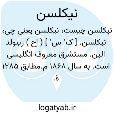 ویلیام نیکلسن ( و. ۱۸۱۵ - ۱۷۵۳ م. ) دانشمند و شیمی دان انگلیسی از نخستین کسانی بود که به تجزیه الکتریکی آب توفیق یافت.رطوبت سنجی اختراع کرد که به نام خود وی معروف است. ماشینی برای چاپ در روی کتان اختراع کرد ( ۱۷۹٠ ). در ۱۸٠۸ [ فرهنگ عملی و نظری شیمی ] را تالیف نمود. نیکلسن ( رینولد ). دانشمند و مستشرق انگلیسی ( و. ۱۸۶۸ - ف. ۲۸ اوت ۱۹۴۵ ). پدر و اجدادش از علمائ بودند و وی اغلب السنه شرقی را نزد جدش فراگرفت. تحصیلات خود را در ادبیات یونانی تکمیل کرد و از ابتدای کار نظرش این بود که ادبیات و تمدن اسلامی را مطالعه و تحقیق نماید و در این باره از ادوارد براون اطلاعات جامعی بدست آورد و او وی را به افکار و نوشته های صوفیان آشنا ساخت و دیری نپائید که نیکلسن نخستین کتاب خود را بنام [ منتخب اشعار شمس تبریزی ] منتشر کرد. نیکلسن ابتدا در دانشگاه لندن بتدریس زبان فارسی پرداخت ولی در سال ۱۹٠۳ به استادی زبان در کمبریچ انتخاب و مشغول تعلیم گردید پس از مرگ ادوارد براون کرسی وی را بدست آورد. بزرگترین شاهکار و خدمت این دانشمند به ادبیات ایران زمین تصحیح و ترجمه مثنوی مولانا جلال الدین رومی است که متعاقب آن کتاب دیگری بنام شرح مثنوی انتشار داد و سایر آثارش بدین قرار است: ۱ - تذکره الاولیائ شیخ عطار.۲ - تحقیقات درباره تصوف اسلامی. ۳ - تحقیقات درباره شعر اسلامی. ۴ - معنی شخصیت در تصوف. ۵ - عرفای اسلام. ۶ - تاریخ ادبیات عرب. ۷ - شعر و نثر شرقی که حاوی ترجمه اشعاری از ابوسعید ابوالخیر انوری عطار باباکوهی فردوسی جلال الدین رومی سعدی عنصری حافظ دقیقی و رودکی است. وی بیش از فضلای دیگر مغرب زمین بحقیقت عالم عرفان آشنائی یافت و توانست بسیاری از شاهکارهای عرفا و تصوف اسلام را بدنیای غرب بشناساند.